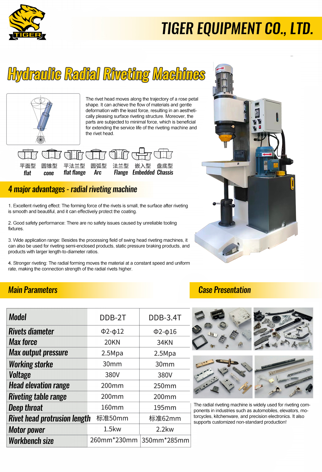 TIGER Radial Riveting Machine has high precision, with a fine-tuning function for the spindle stroke. The fine-tuning unit is 0.07 mm, and it has high repeatability in positioning accuracy. Moreover, it can easily and quickly replace riveting rods. The machine is equipped with Japanese NSK imported bearings, ensuring long service life and high operational efficiency